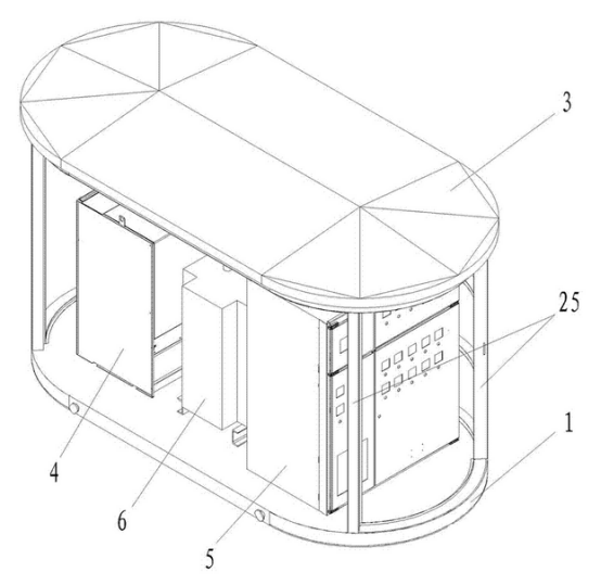 箱體外殼由材料層、龍骨與防護鋼板層三層組成,可以較好地對變電站內(nèi)的用電設(shè)備進行較好地保護;箱體外殼為橢圓柱狀,結(jié)構(gòu)更加緊密牢固。箱體外殼的前表面設(shè)置有雙開門,箱體外殼的表面均勻地設(shè)置有電纜線孔且所述電纜線孔內(nèi)貫穿有電纜線。與周圍的環(huán)境相適應(yīng),同時也提高了變電站的通風散熱的效率。
