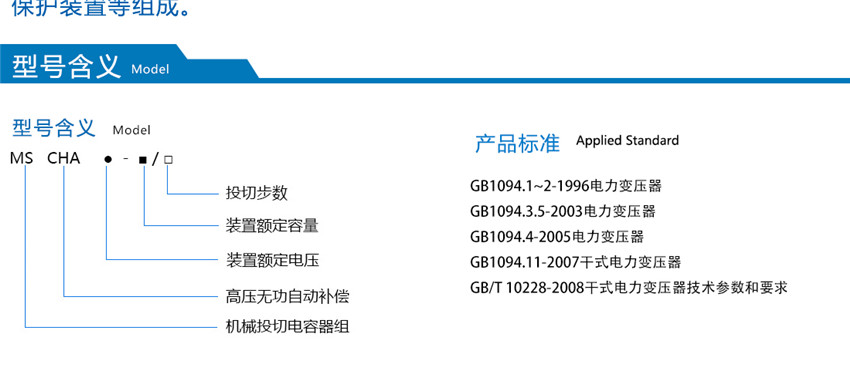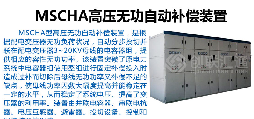 MSCHA型高壓無功自動(dòng)補(bǔ)償裝置,是根據(jù)配電變壓器無功負(fù)荷狀況,自動(dòng)分步投切并聯(lián)在配電變壓器3~20kV母線的電容器組,提供相應(yīng)的容性無功功率。該裝置突破了原電力系統(tǒng)中電容器組使用整組進(jìn)行固定補(bǔ)償投入時(shí)造成過補(bǔ)而切除后母線無功功率又補(bǔ)償不足的缺點(diǎn),使母線功率因數(shù)大幅度提高并能穩(wěn)定在一定的水平,從而穩(wěn)定了系統(tǒng)電壓、提高了變壓器的利用率。裝置由并聯(lián)電容器、串聯(lián)電抗器、電壓互感器、避雷器、投切設(shè)備、控制和保護(hù)裝置等組成。