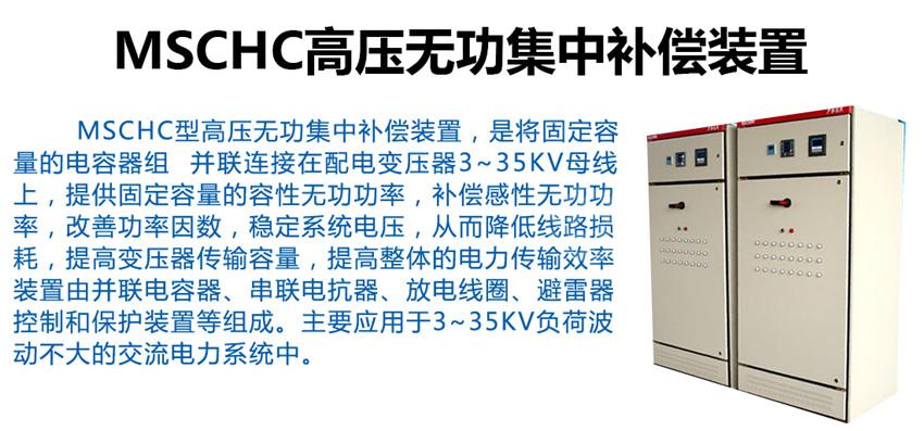 MSCHC型高壓無(wú)功集中補(bǔ)償裝置,是將固定容量的電容器組 并聯(lián)連接在配電變壓器3~35kV母線上,提供固定容量的容性無(wú)功功率,補(bǔ)償感性無(wú)功功率,改善功率因數(shù),穩(wěn)定系統(tǒng)電壓,從而降低線路損耗,提高變壓器傳輸容量,提高整體的電力傳輸效率。裝置由并聯(lián)電容器、串聯(lián)電抗器、放電線圈、避雷器、控制和保護(hù)裝置等組成。主要應(yīng)用于3~35kV負(fù)荷波動(dòng)不大的交流電力系統(tǒng)中
