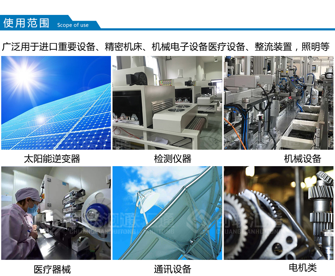 廣泛用于進(jìn)口重要設(shè)備、機密機床、機械電子設(shè)備、醫(yī)療設(shè)備、整流裝置、照明等,安裝場所應(yīng)無嚴(yán)重影響變壓器絕緣強度的氣體,蒸汽,化學(xué)性沉積,污垢,導(dǎo)電塵埃及無其他易爆易燃易腐蝕的物質(zhì)。